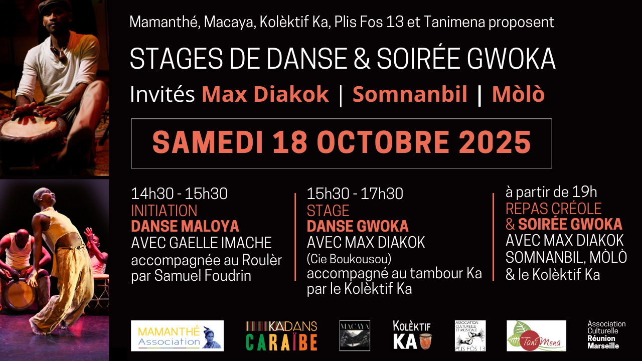 Les associations Mamanthé, Macaya, Kolèktif Ka, Plis Fos 13 et Tanimena se rassemblent pour vous proposer un événement autour du Maloya (musique traditionnelle de La Réunion) et du Gwoka (musique traditionnelle de Guadeloupe).